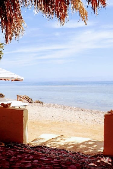 À Bedouin Star, la détente est à l'honneur : transats confortables et cabanes ombragées offrent un refuge parfait contre le soleil. Le doux clapotis des vagues contribue à la sérénité des lieux.